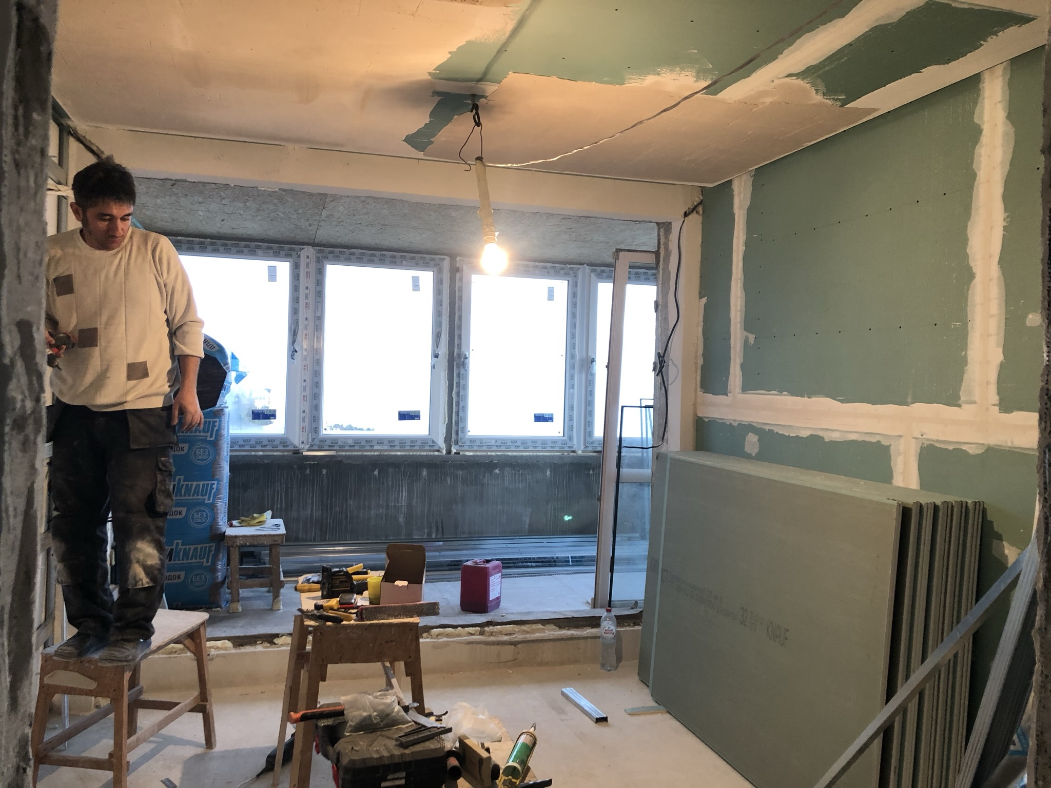 - Выравнивания поверхностей 1 (штукатурка стен, потолка, откосов, монтаж системы ГКЛ)